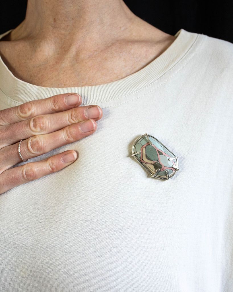(Finalist in the Northern Beaches Environmental Art and Design Prize) Sterling silver, copper, clay pipe remnants, vitreous enamel.