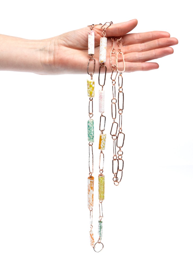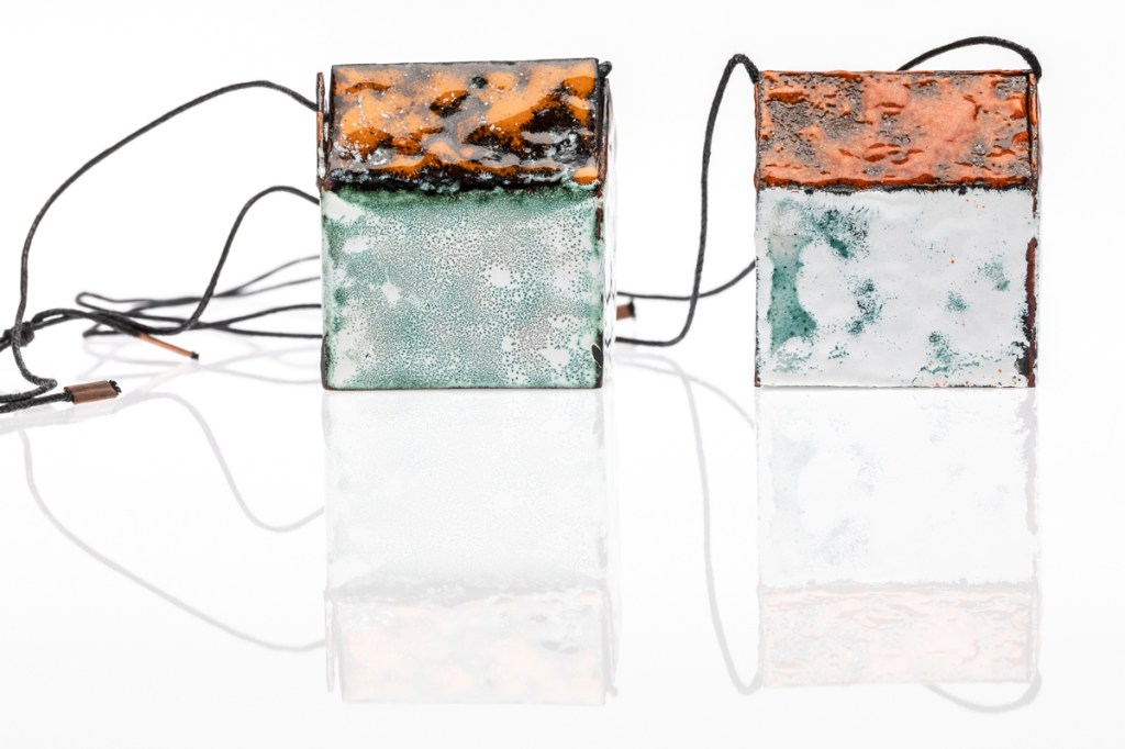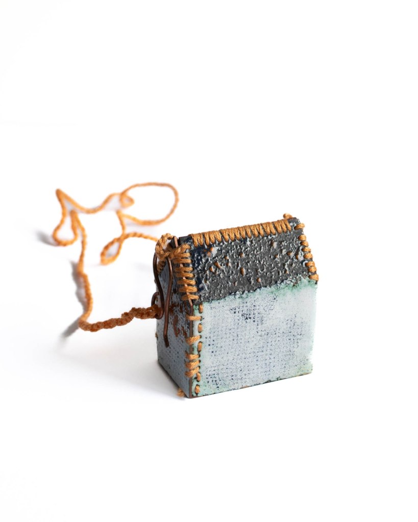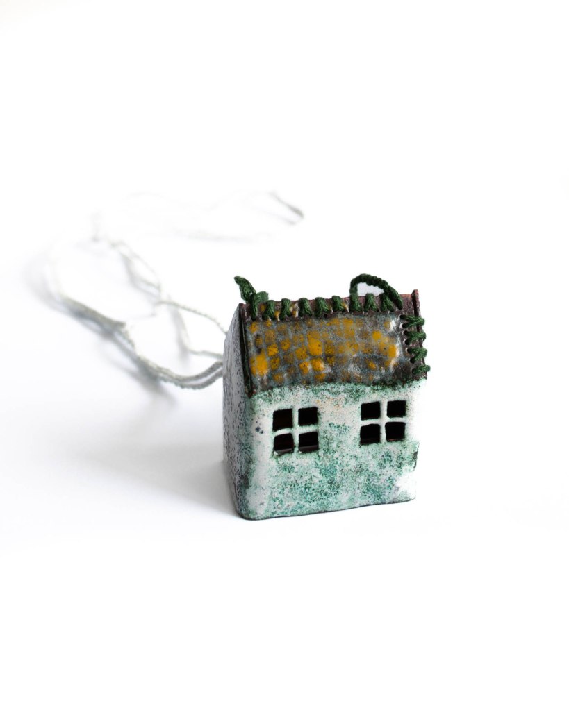 These copper houses have been hand fabricated and coloured using vitreous enamel. They have been stitched by hand.